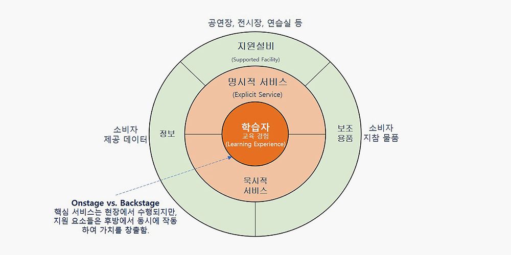 문화예술교육을 산업으로 정의하기 위해서는, 이 분야가 제조업이 아닌 서비스 산업에 속한다는 인식에서출발해야 한다. 제조업이 유형의 상품을 ‘생산’한다면, 서비스업은 무형의 가치를 ‘전달’한다. 문화예술교육은 결과물이 아닌 교육 과정 안에서 가치가 창출되는 전형적인 서비스 산업이다. 무형성·비분리성·이질성·소멸성이라는 서비스의 4대 속성이 문화예술교육 현장에서 고스란히 발현되는 이유가 여기에 있다. 이번 연구에서는 이러한 서비스 산업의 특성을 반영한 이론적 틀로 ‘서비스 패키지(Service Package)’ 개념을 채택했다. 서비스 패키지는 특정 서비스 전달을 위한 재화와 개별 서비스의 묶음으로, 그 중심에는 향유자가 경험해야 할 공급자의 ‘의도된 서비스 경험’이 있다. 이 경험이 향유자에게 온전히 전달되기 위해서는 공급자의 명시적 서비스(교육 행위 자체)와 이를 뒷받침하는 지원설비, 보조용품, 정보가 유기적으로 결합해야 한다.