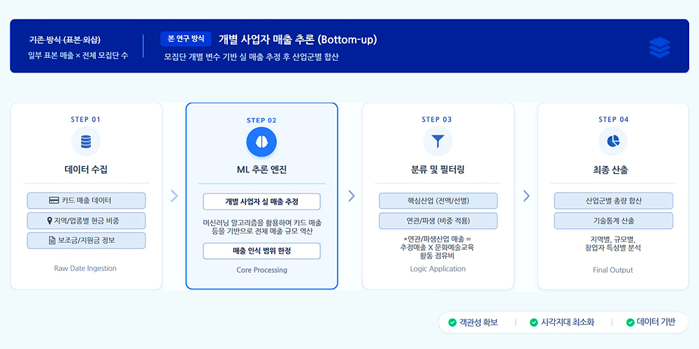 시장의 실체를 데이터로 규명하는 과정은 방법론적 정밀함이 요구되는 작업이었다. 이번 연구는 기존의 ‘표본조사’ 방식(일부 표본 매출×전체 모집단 수)을 지양하고, 모집단에 속한 개별 사업자의 변수를 기반으로 사업자별 실매출을 추정한 뒤 산업군별로 합산하는 ‘바텀업(Bottom-up)’ 방식을 채택했다. 연구진은 데이터 신뢰성 확보를 위해 다음과 같은 3단계 분석 과정을 거쳤다.